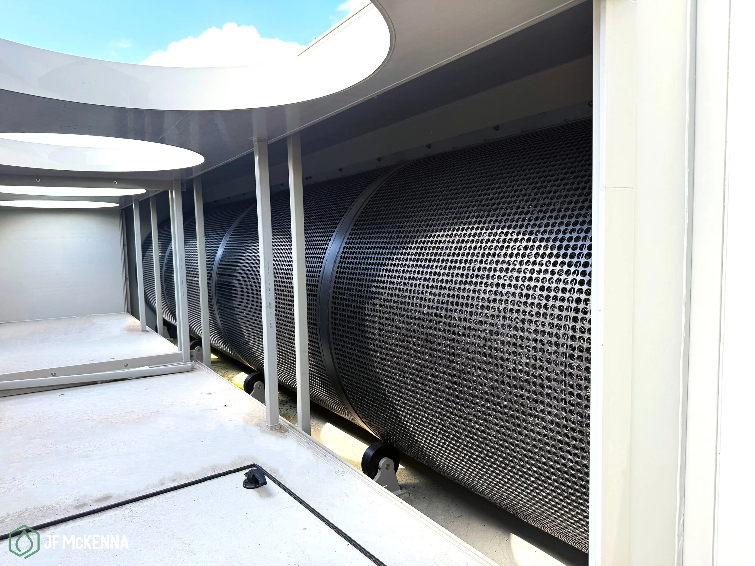As air leaves the building through extraction fans, it enters the ‘air scrubber’ where it passes through a water curtain and is washed before being expelled to the outside environment. To maintain good water quality for maximum performance, a connectivity sensor measures the nitrogen in the water and when too high, instructs a valve to send the concentrate to a waste tank. This means the system can continue to run and requires minimal maintenance. The remaining water continues to circulate being heated by the washed air. This heat energy can be later used to condition air for optimal climate back in the building.