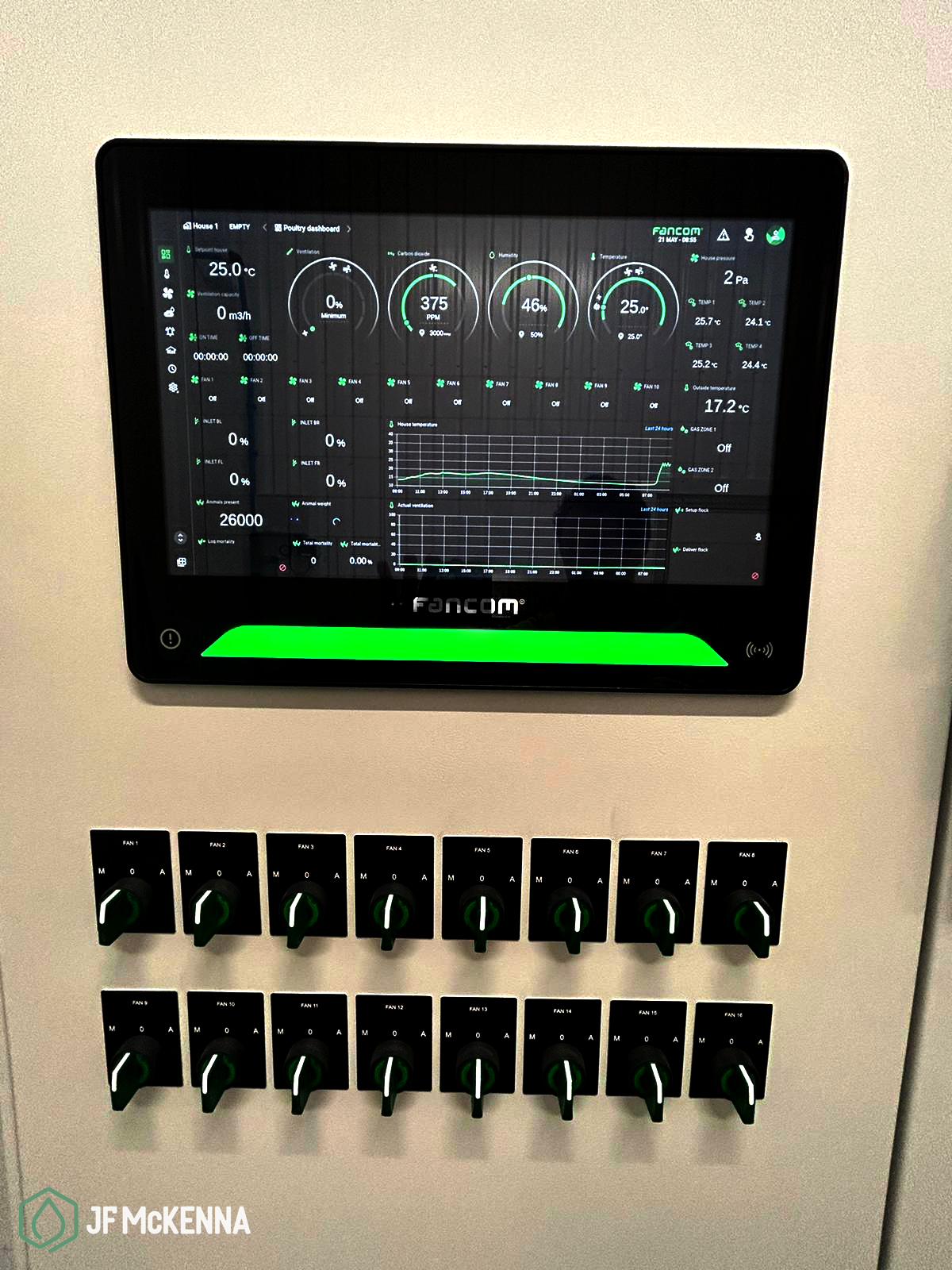 JF McKenna installed and commissioned the Fancom One controller, ventilation, sensors and adesys alarm, along with HATO Corax lights on this 1 x 280 x 80ft broiler house in May.