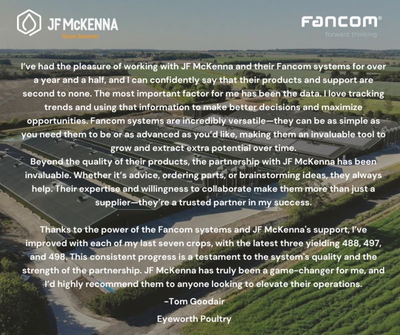 Tom has worked with JF McKenna and Fancom equipment for over a year and a half and has repeatedly highlighted the value of accurate data, responsive controls and reliable support. Access to clear, real time trends has allowed him to make informed decisions that protect bird welfare and maximise output. Each of his recent crops has shown continuous improvement which is a direct reflection of the environment created by his Fancom systems.